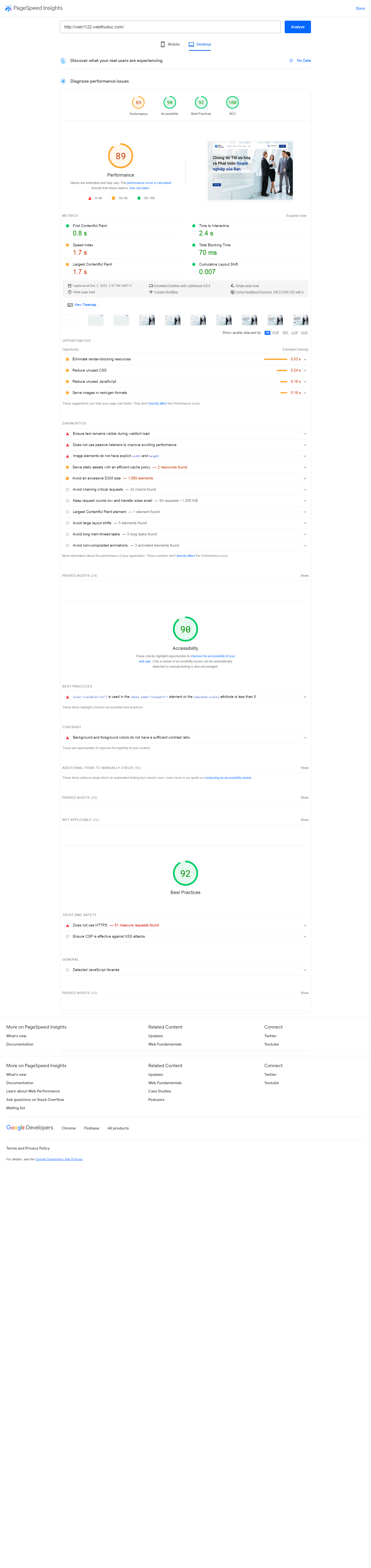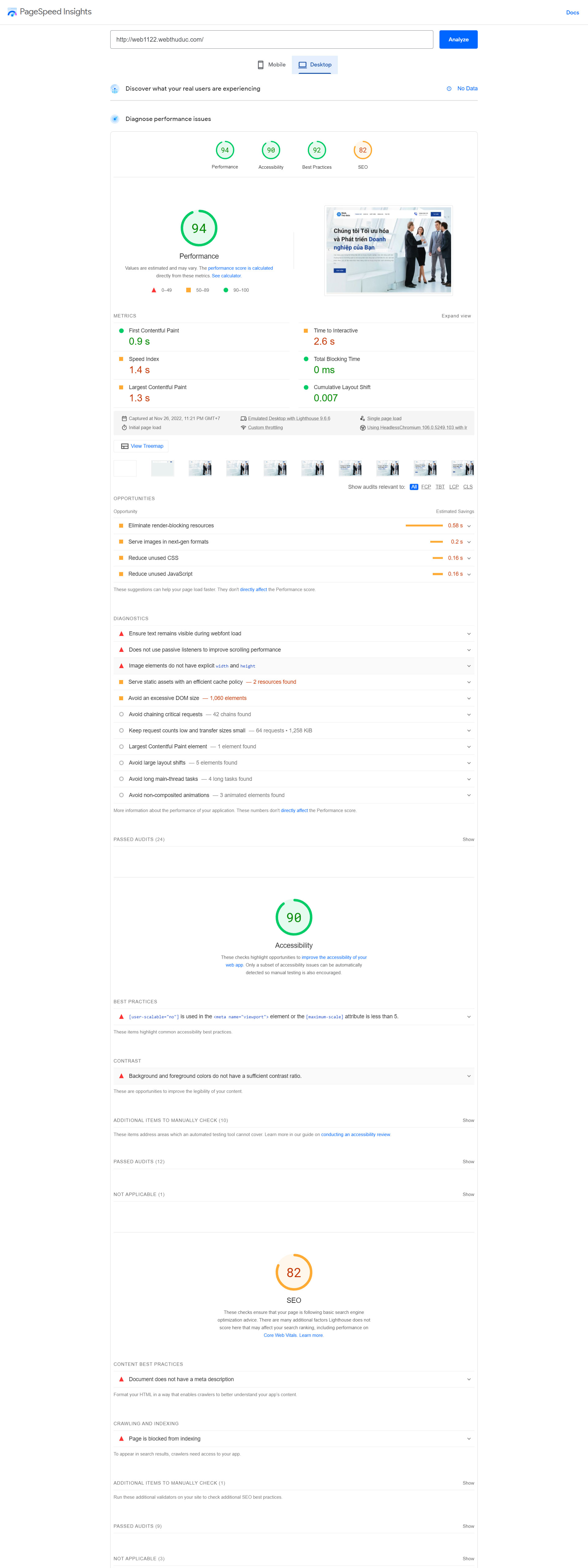 Theo kết quả liên kết hình ảnh trên thì website demo của chúng tôi đạt trên 90 điểm các hạng mục: Hiệu suất, Tính tiếp cận sử dụng, Kỹ thuật… Chỉ riêng SEO do trang web chúng tôi làm với mục đích demo cho khách hàng nên đã chặn Google index và không cập nhật nội dung thẻ meta SEO, tuy nhiên điểm số trên 80 cũng thể hiện trang web chuẩn SEO. Lưu ý: các thử nghiệm được thực hiện vào ngày 26 tháng 11 năm 2022 bằng cách sử dụng Google PageSpeed Insights để điền vào bảng ở trên. Chúng tôi tiến hành chạy thử nghiệm Google PageSpeed nhiều 8 lần và 5/8 lần là đạt kết quả trung bình như trên. Truy cập website demo của chúng tôi tại: web1122.webthuduc.com